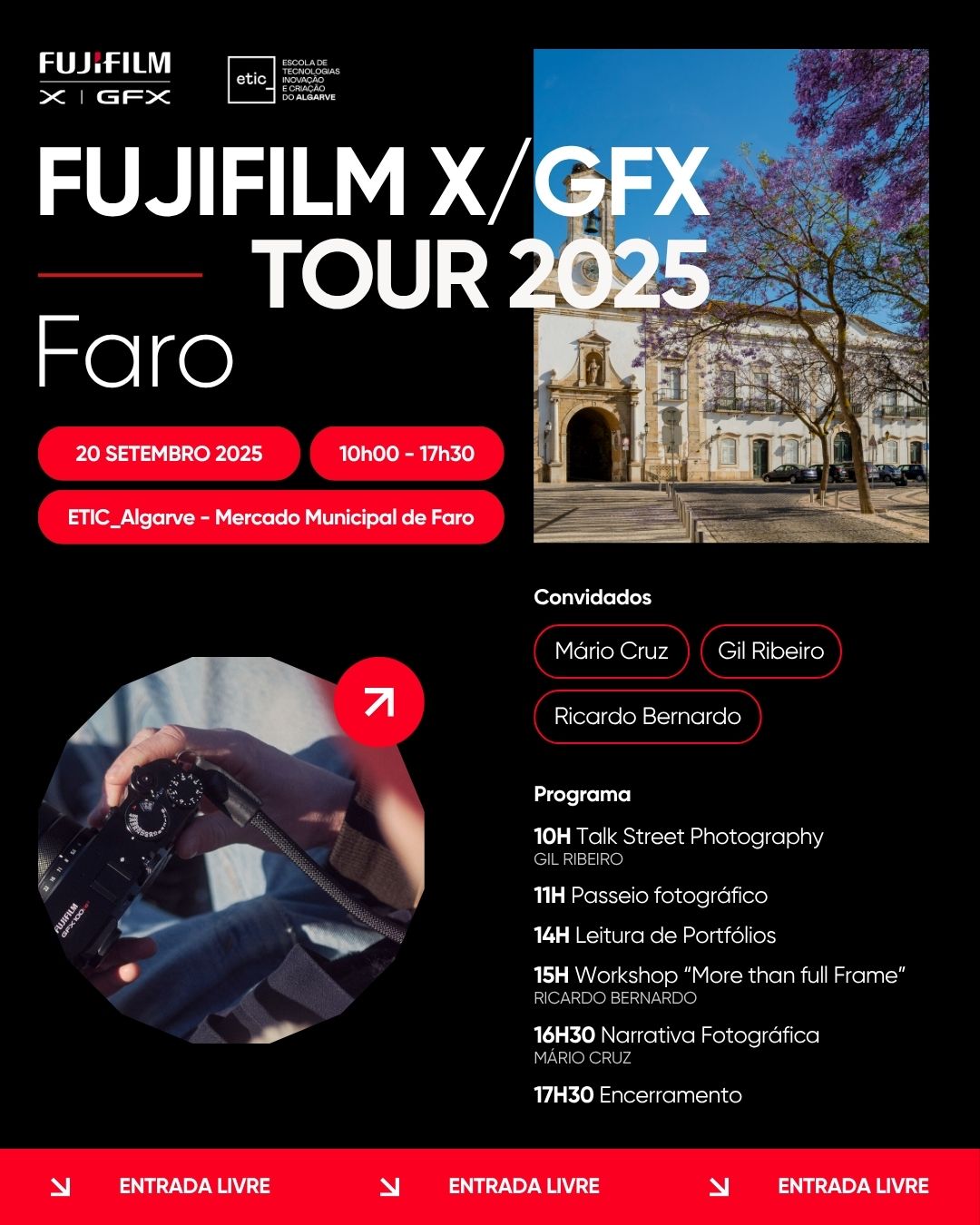 A Fujifilm X/GFX Tour 2025 chega à ETIC_Algarve no dia 20 de setembro de 2025, trazendo um dia inteiro de atividades dedicadas à fotografia, desde talks inspiradoras até workshops práticos.